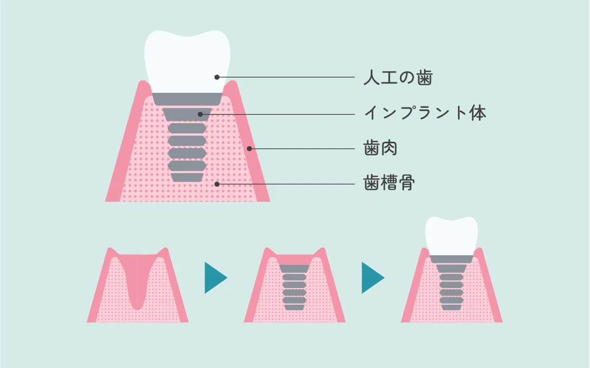 インプラントは、失った歯の代わりに人工の歯根(チタン製)を埋め込み、その上に人工の歯を装着する治療法です。